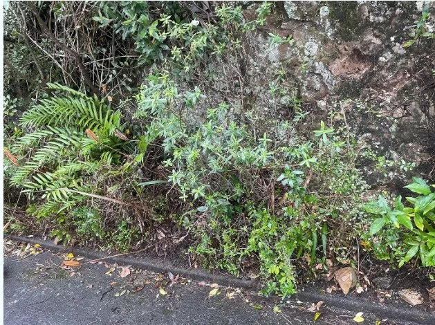 There are a lot of ‘good’ plants in there, but because they are so tiny in leaf shape, don’t match and are leggy, it just looks like a mess. So in this case we would either keep the coprosma and plant more (smaller leaved thing on the far right) or plant more ferns (like the one on the far left). Obviously the fern is the most striking here.
