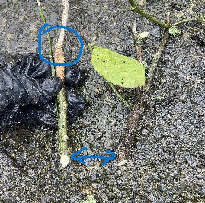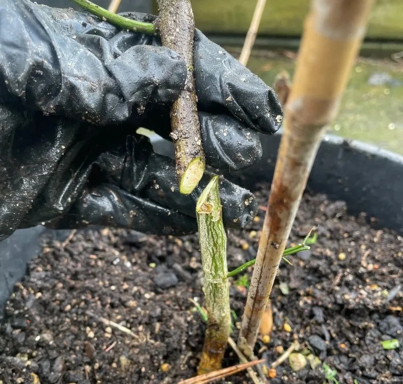 I’ve circled the old graft for your interest. Down the bottom I have cut off the existing shoot about 5cm up from the soil level, and cut off a shoot from my cutting which is the same diameter. Make sure everything is clean!