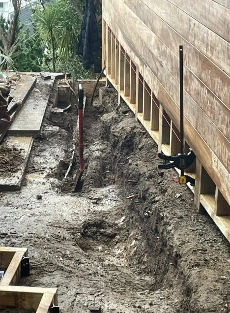 Digging a trench, while the builder builds a fence at the same time, surrounded by pipes and footings, in the pouring rain because it has to be done before the next day. Woooo!